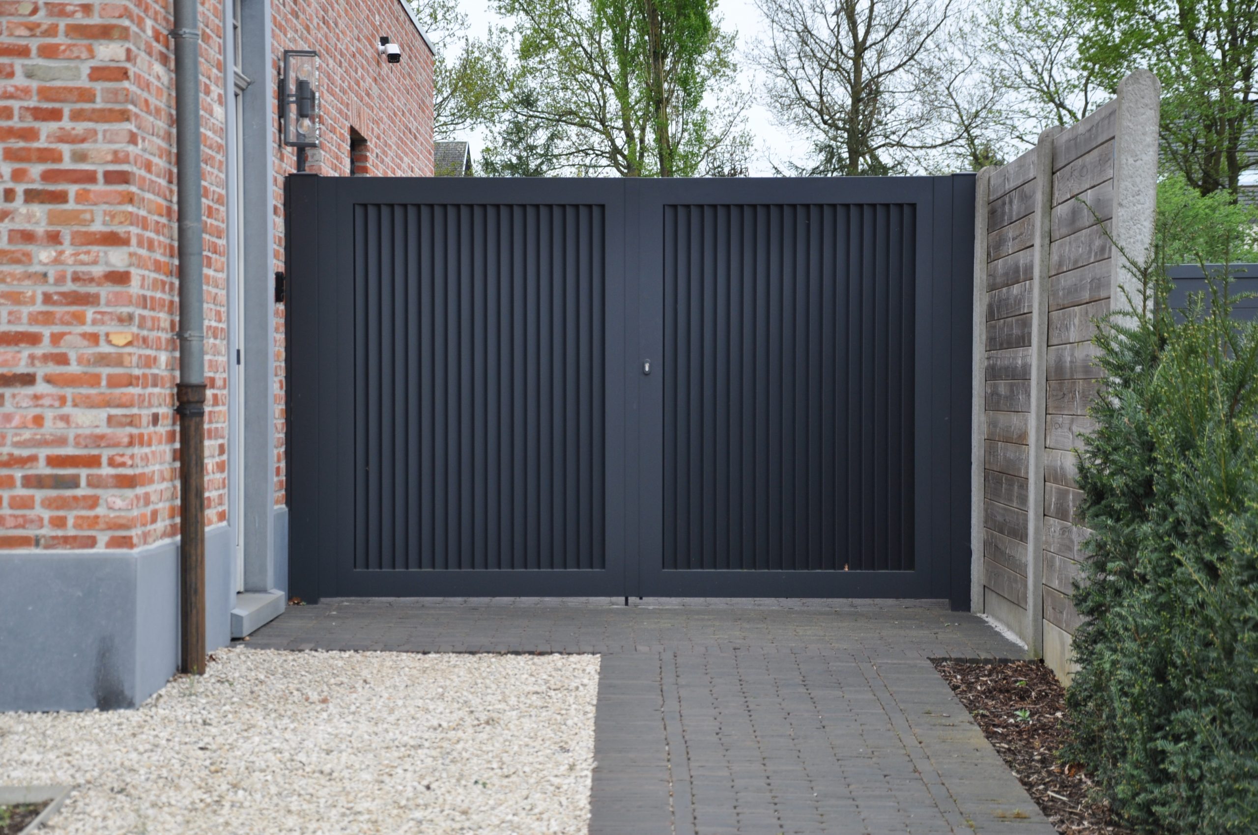 Poortvulling in de kader met ingewerkte schuine profielen van 60x20x2mm op onderlinge afstand van 1cm (horizontaal of verticaal)